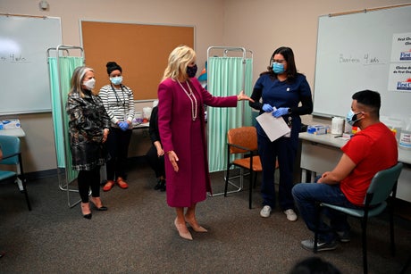 First lady Jill Biden is kicking off a three-day, two-state visit to the U.S. Southwest with a tour of a vaccination clinic in New Mexico, where early efforts to get people registered for shots helped to propel the state's standing as a national leader in vaccine distribution.