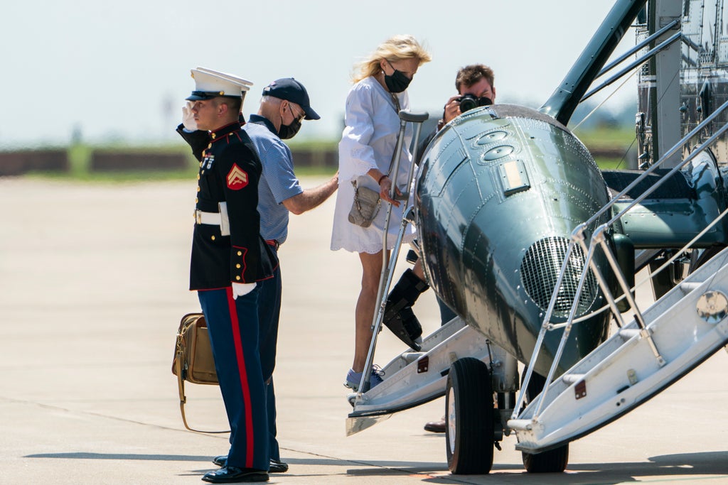 The boot was on the first lady's left foot Friday as she and President Joe Biden boarded a helicopter in Delaware to fly to the Camp David presidential retreat in Maryland She also held onto crutches.