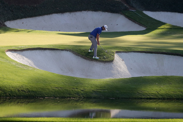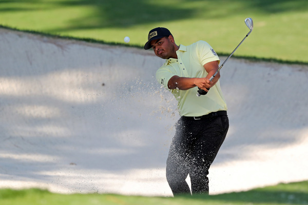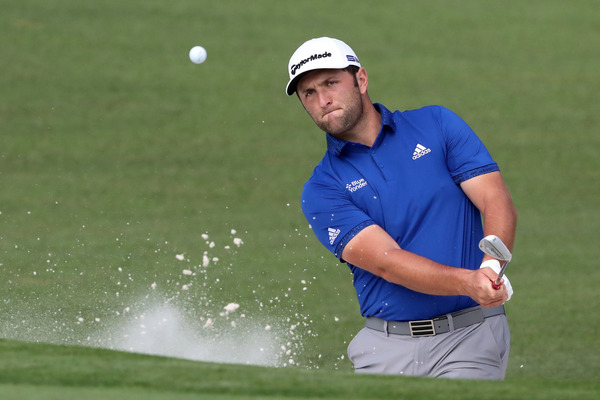 Jon Rahm chips from the lip of a bunker at the 12th green during the third round of the Masters at Augusta National Golf Club on Saturday, Nov. 14, 2020, in Augusta, Georgia. (Curtis Compton/Atlanta Journal-Constitution/TNS)