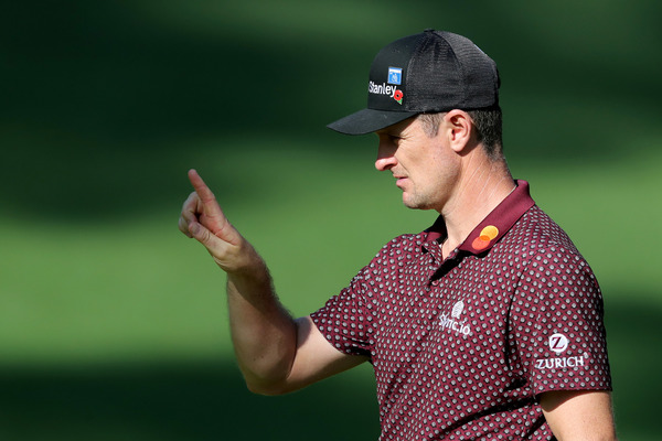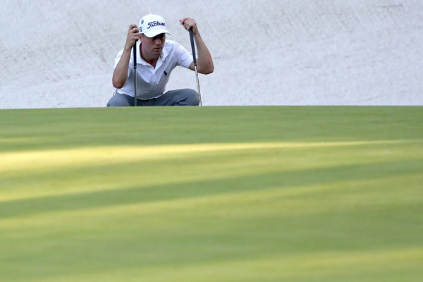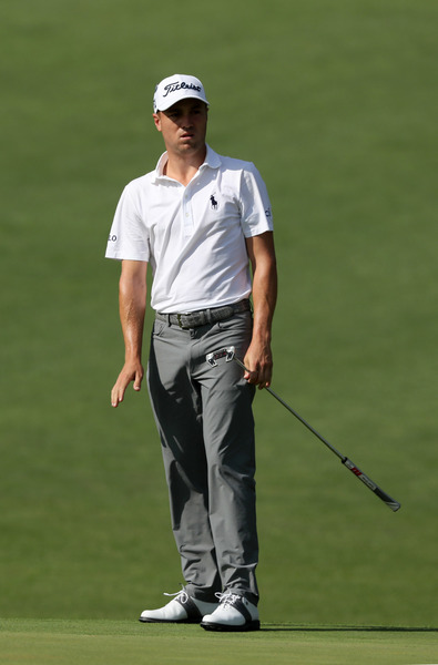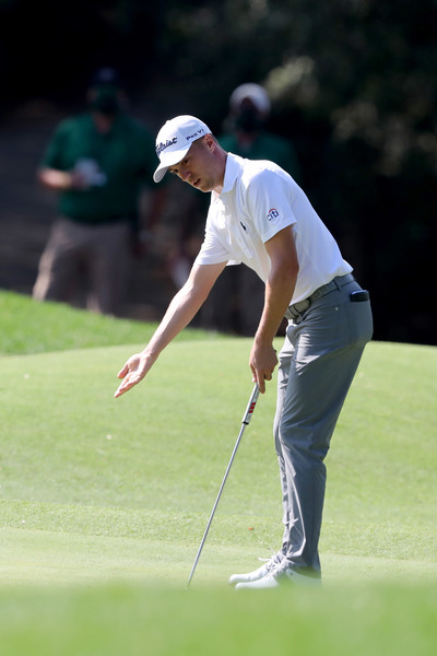 Justin Thomas reacts to his putt on the 2nd hole during the third round of the Masters at Augusta National Golf Club on Saturday, Nov. 14, 2020, in Augusta, Georgia. (Curtis Compton/Atlanta Journal-Constitution/TNS)