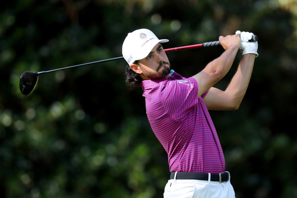 Abraham Ancer reacts to a chip on the 2nd hole with caddie Dale Vallely during the third round of the Masters at Augusta National Golf Club on Saturday, Nov. 14, 2020, in Augusta, Georgia. (Curtis Compton/Atlanta Journal-Constitution/TNS)