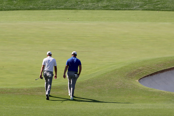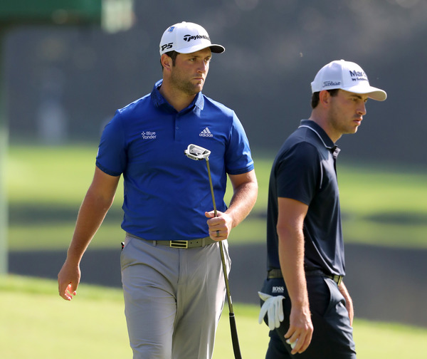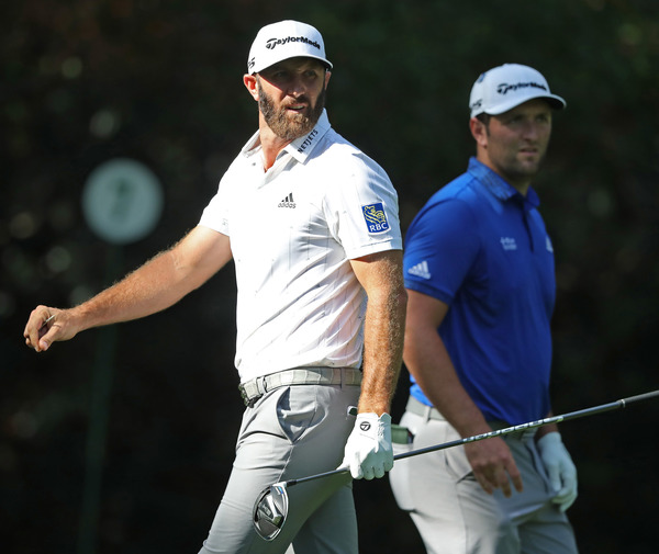 Dustin Johnson, left, and Jon Rahm walk to the 4th green during the third round of the Masters at Augusta National Golf Club on Saturday, Nov. 14, 2020, in Augusta, Georgia. (Curtis Compton/Atlanta Journal-Constitution/TNS)