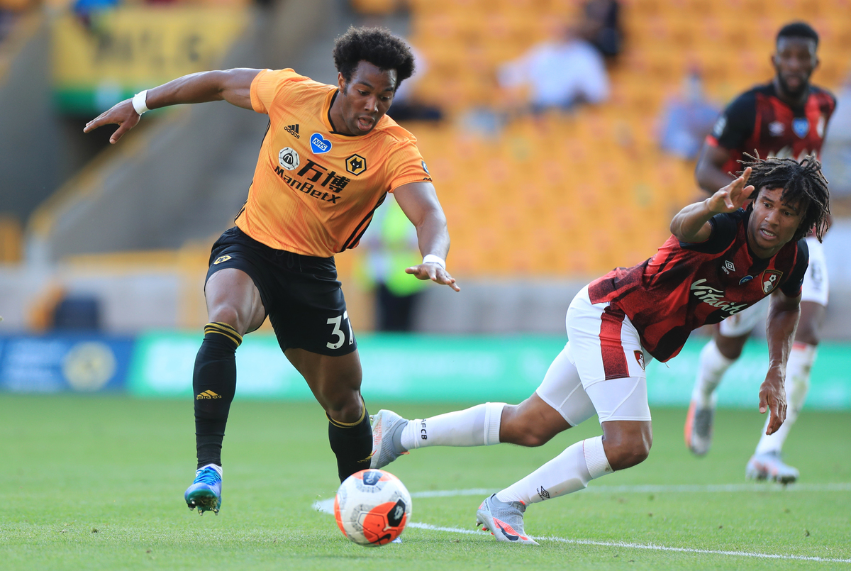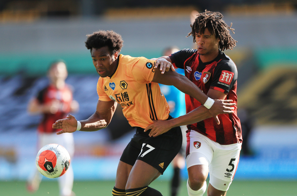 Soccer Football - Premier League - Wolverhampton Wanderers v AFC Bournemouth - Molineux Stadium, Wolverhampton, Britain - June 24, 2020 Wolverhampton Wanderers' Adama Traore in action with Bournemouth's Nathan Ake, as play resumes behind closed doors following the outbreak of the coronavirus disease (COVID-19) Mike Egerton/Pool via REUTERS
