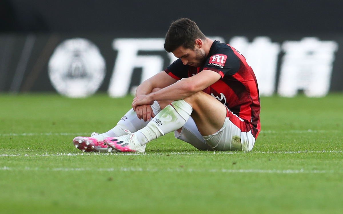 Soccer Football - Premier League - Wolverhampton Wanderers v AFC Bournemouth - Molineux Stadium, Wolverhampton, Britain - June 24, 2020 Bournemouth's Adam Smith reacts after sustaining an injury as Wolverhampton Wanderers' Joao Moutinho looks on, as play resumes behind closed doors following the outbreak of the coronavirus disease (COVID-19) Mike Egerton/Pool via REUTERS