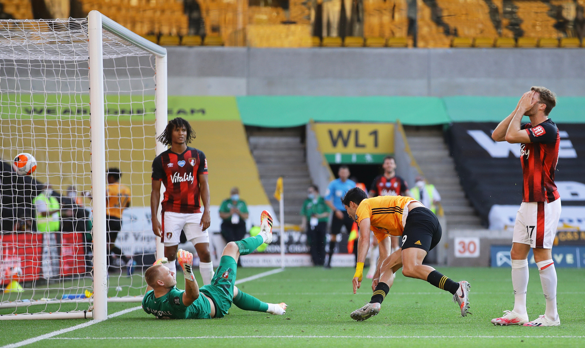 Soccer Football - Premier League - Wolverhampton Wanderers v AFC Bournemouth - Molineux Stadium, Wolverhampton, Britain - June 24, 2020 Wolverhampton Wanderers' Raul Jimenez celebrates scoring their first goal as Bournemouth's Aaron Ramsdale looks dejected with teammates, as play resumes behind closed doors following the outbreak of the coronavirus disease (COVID-19) Richard Heathcote/Pool via REUTERS