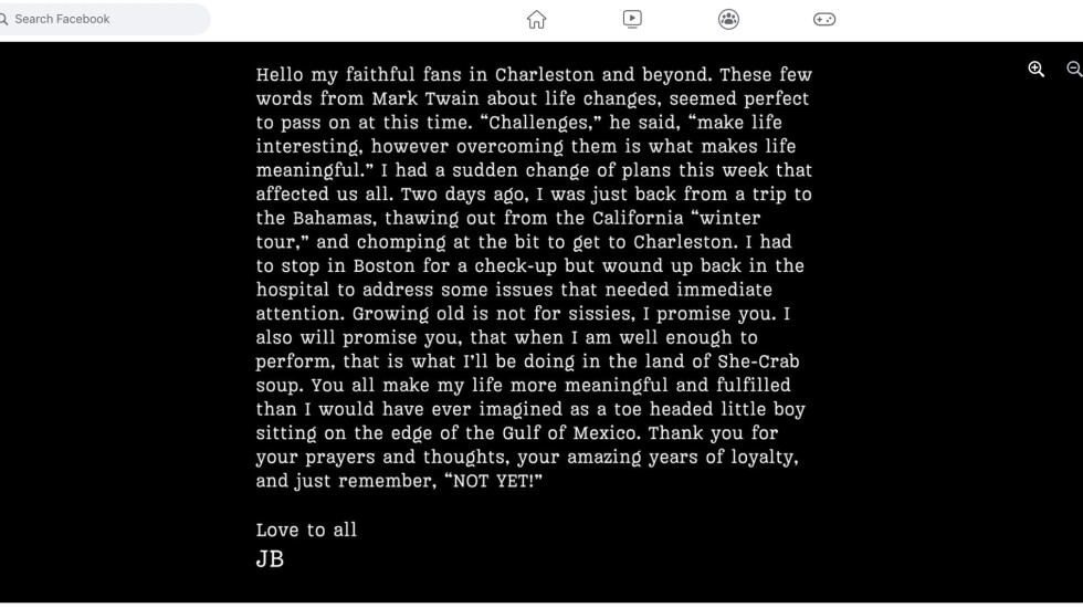 “Growing old is not for sissies, I promise you. I also will promise you that when I am well enough to perform, that is what I’ll be doing in the land of She-Crab soup,” Buffett added, ending his post with the reassurance “just remember, NOT YET!”