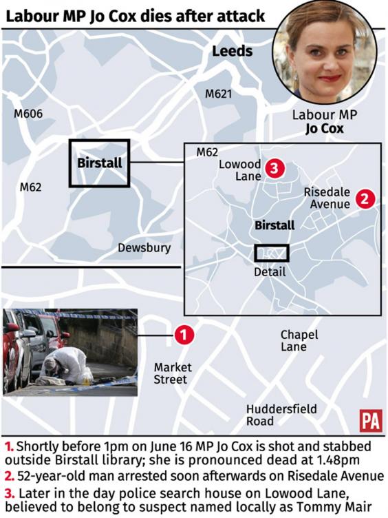 The suspect, who was arrested at the scene, was named locally as Thomas Mair, aged 52. He was reported to have shouted “Britain First” during an attack in which he fired three shots from close range while at the same time stabbing the MP with a knife.