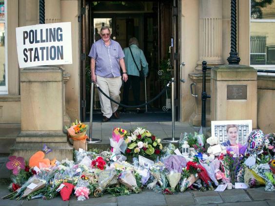 Flowers and tributes have been left outside a polling station in Batley in memory of Jo Cox.