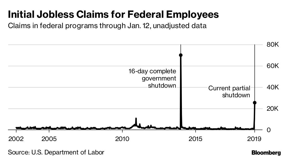 Claims aren’t likely to spike the same way they did during the prior impasse in 2013, when the tally for federal-worker filings in one week hit about 70,000, because the current shutdown is partial and doesn’t affect as many furloughed workers, who are eligible to apply for unemployment benefits.