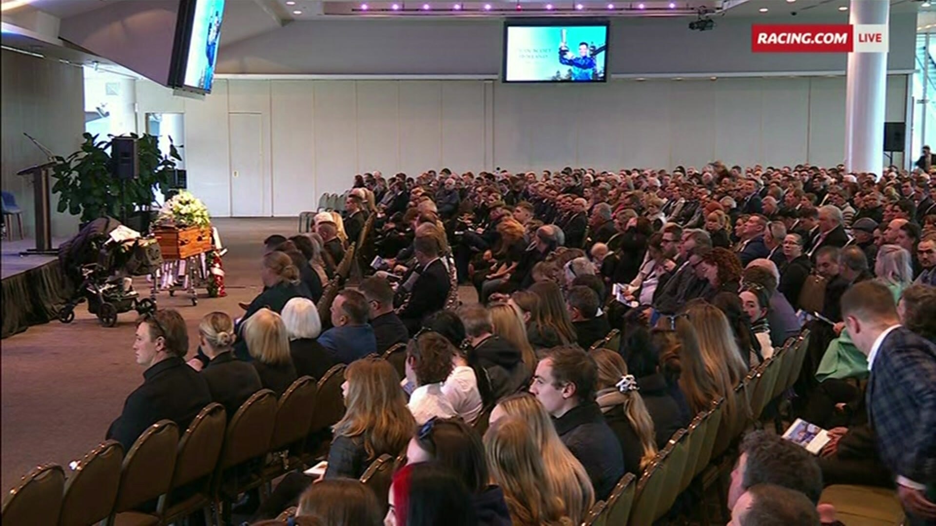 A guard of honour was formed on the race track after the ceremony, with two riders on horseback leading a hearse down the race track towards the winning post as hundreds watched on clapping.