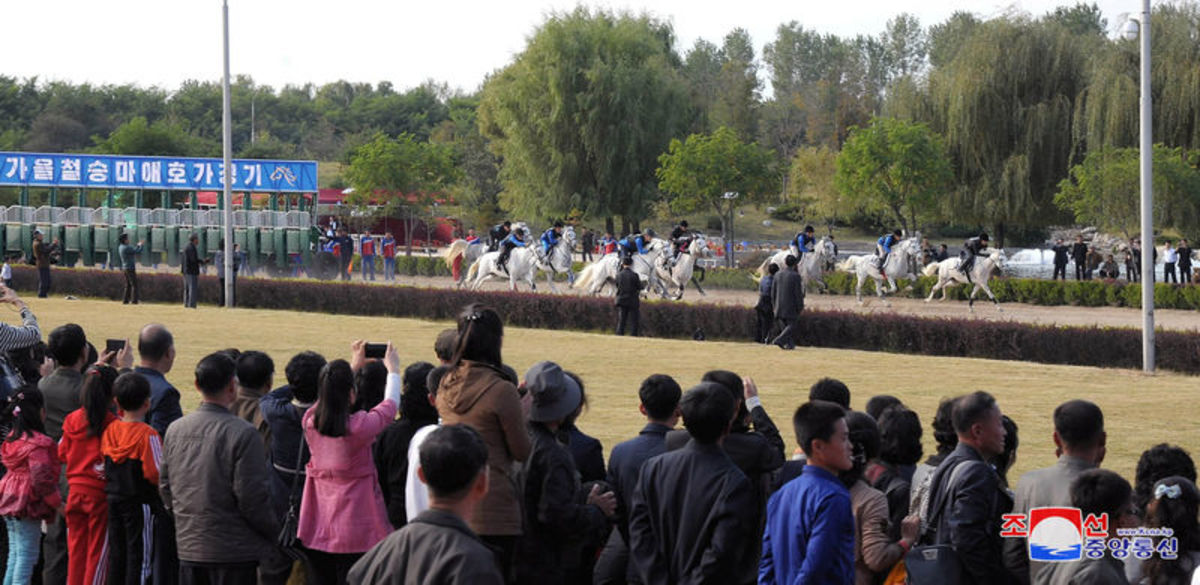 Pictures from KCNA showed hundreds of spectators watching and filming with their phones as a field of mostly white-grey horses and their riders stormed out of the starting gate.