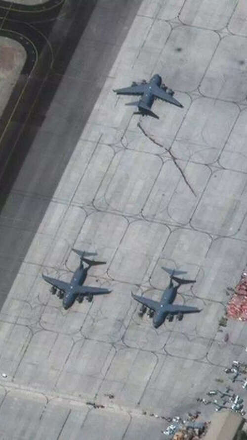 Reuters2/10:A view of people waiting in line to board the C-17 Globemaster III aircraft.