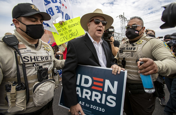 Maricopa County Sheriff Deputies escort Biden supporter Ron Russ of Peoria away from an harassing crowd of pro-Trump supporters who have gathered in the parking lot of the Maricopa county elections building to protest election results on November 6, 2020 in Phoenix, Arizona. Russ said he came here because his father was a WWII vet and is buried at Arlington National Cemetery. (Gina Ferazzi/Los Angeles Times/TNS)