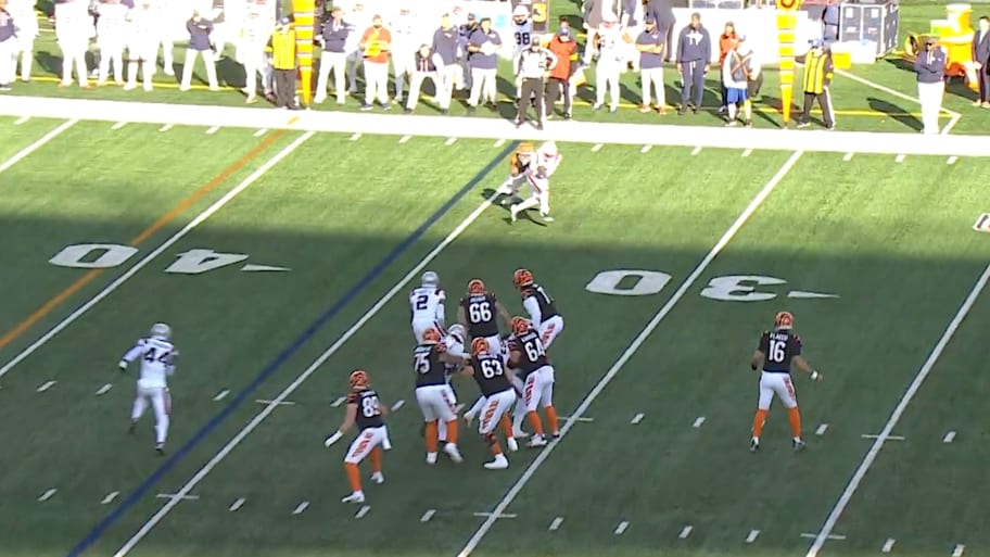 The Bengals led the Patriots 10-7 midway through the second quarter and were moving the ball out of their own end. On second-and-5 from their own 36-yard line, Flacco dropped back, surveyed the field, and decided to dump the ball off to running back Tahj Brooks, who was his safety valve on the play. It was a horrid decision.