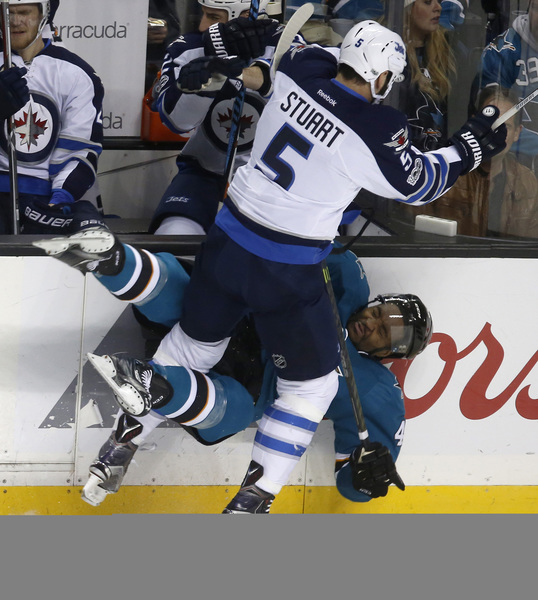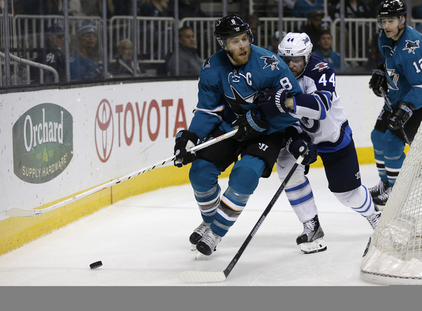 SAN JOSE, Calif. _ San Jose Sharks forward Joel Ward looked up and thought he had some time as he went to retrieve the puck along the boards near the bench of the Winnipeg Jets.