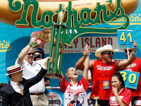 Miki Sudo notched a fourth straight win in the women's competition. The Las Vegas woman ate 41 hot dogs and buns to beat Michelle Lesco of Tucson, Arizona, who downed 32 franks and buns.
