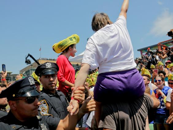 During the men's competition, five people were taken into custody for trying to disrupt the event, police said. The people appeared to be attempting to unfold a black banner before police stopped them and took them away. People for the Ethical Treatment of Animals (Peta) members had been giving away free vegan hot dogs outside the event, but spokeswoman Tricia Lebkuecher said the people arrested inside weren't affiliated with Peta.