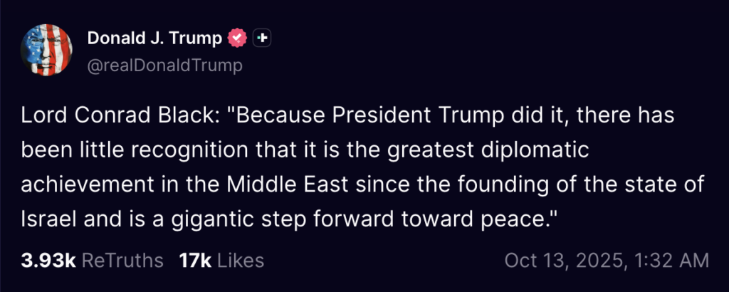 On Sunday, President Trump also shared a comment from Lord Conrad Black on Truth Social, who called the agreement "the greatest diplomatic achievement in the Middle East since the founding of Israel" and hailed it as a historic step toward peace.