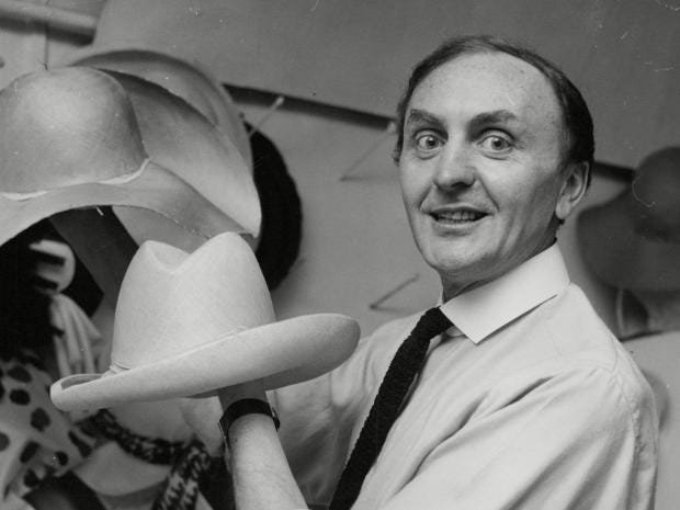 When he started off in the hat trade in postwar England, rationing was still in force and most women were still wearing hand-me-down hats from their mothers. He was an apprentice with the Danish-born Aage Thaarup, at the time the most famous milliner in the UK, before starting his own business in 1951, sleeping under his work table while amassing royal clients based on word of mouth.