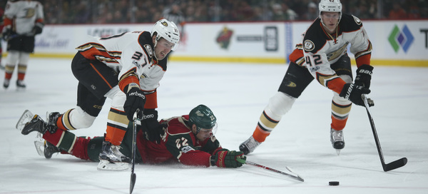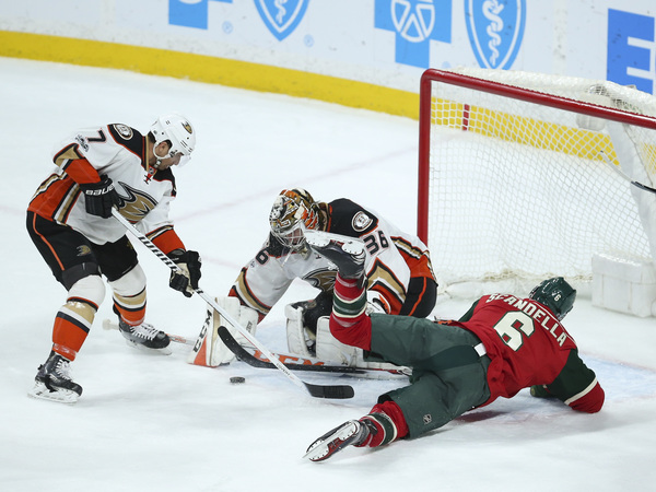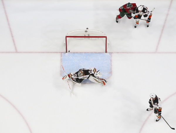 The Ducks got their goal just 4:38 into the game. Corey Perry's sharp-angle shot was stopped by Minnesota goalie Devan Dubnyk but a rebound left at his feet was there for the arriving Joseph Cramarossa to jump on and pop behind him.