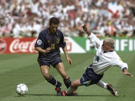 David Seaman’s penalty save from Gary McAllister first stopped the Scots from drawing level, before Paul Gascoigne scored one of the most memorable goals in England’s past at the other end by lifting the ball over Colin Hendry’s head and volleying into the net.