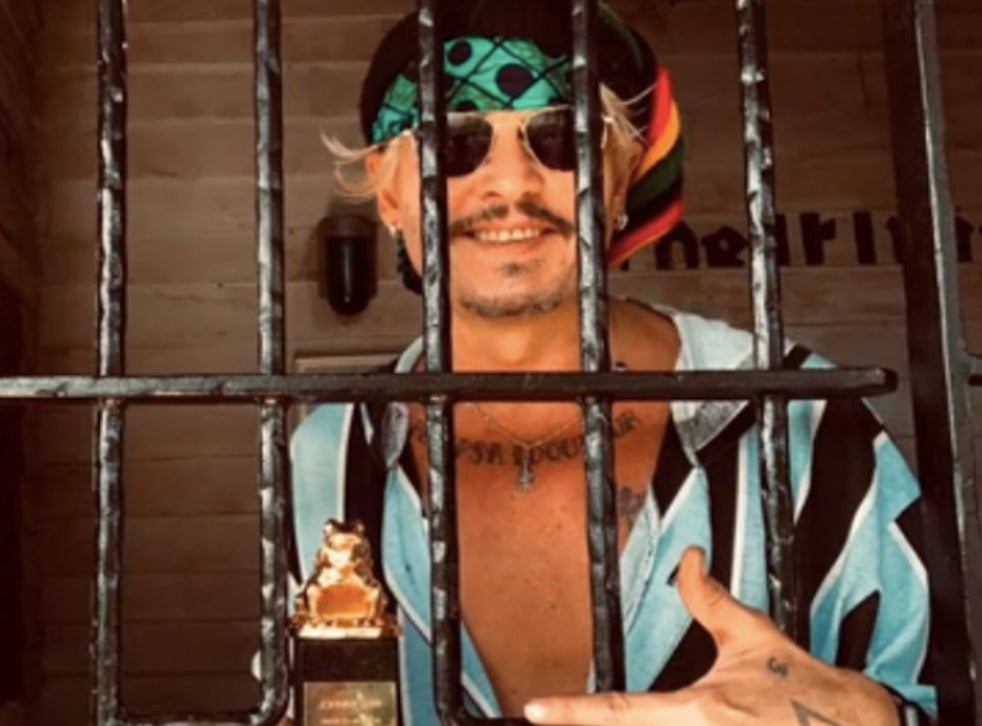 Depp was pictured smiling away while holding his award in the Bahamas, but bizarrely, the photo shows the actor behind bars.