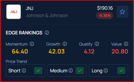 Johnson & Johnson holds a momentum rating of 64.40% and a growth rating of 42.03%, according to Benzinga's Proprietary Edge Rankings. Check the detailed report here.