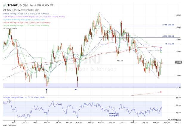 If, however, Johnson & Johnson stock can clear $167.50, it opens the door to the $170 to $173 area.