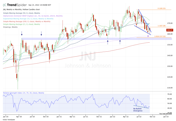 On the weekly chart above, we have a falling wedge pattern in Johnson & Johnson stock. That's bullish if the stock can break out to the upside. That’s a big “if,” particularly in a tape like this.