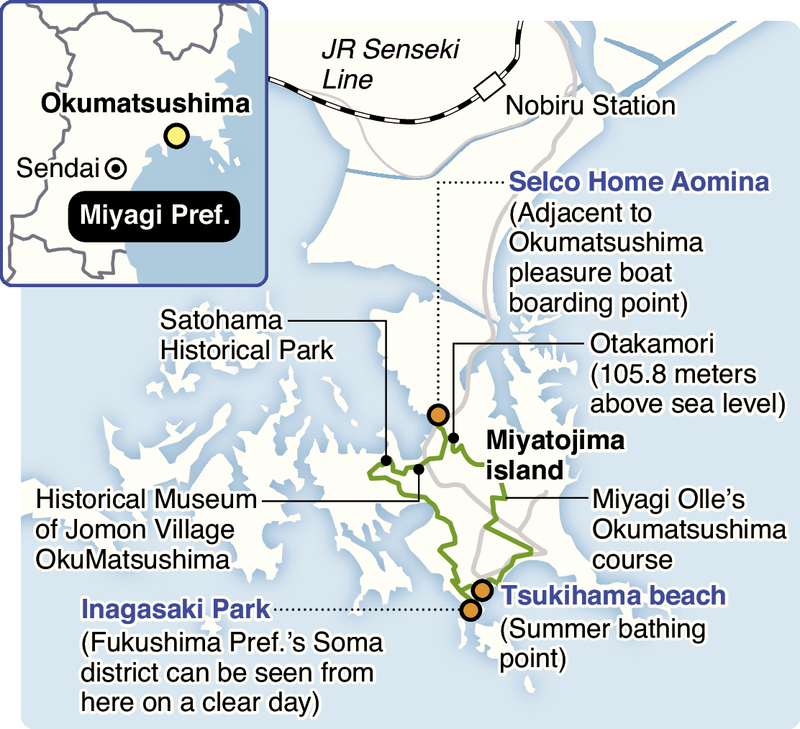 The Okumatsushima course starts and finishes at Selco Home Aomina, a multipurpose facility built for the reconstruction and revitalization of the Miyato district. It also is a gateway to Otakamori, one of the four best viewpoints overlooking Matsushima, a scenic site with a group of small islands. Matsushima is one of three highest-regarded scenic sites in the country.
