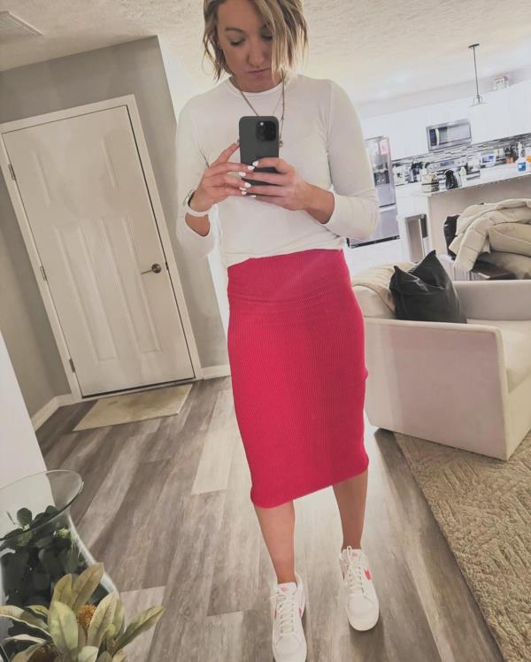 Jordan Larson, the renowned volleyball player, recently shared some delightful glimpses of her casual chic style through a couple of captivating pictures. In one of the images, she can be seen striking a pose in a mirror selfie, exuding an aura of effortless style. Larson is dressed in a crisp white top paired with pink bottoms, complemented by stylish white shoes. This ensemble not only showcases her impeccable fashion sense but also reflects a perfect blend of comfort and trendiness.