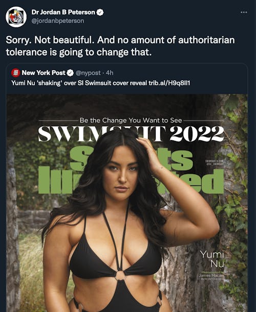 The latter scenario is exactly where we find ourselves after Peterson — a longtime purveyor of bonehead misogyny — fired up the ol’ genius brain, and decided to send out this wholesome tweet about model/singer Yumi Nu, who recently appeared on the cover of Sports Illustrated’s famed swimsuit edition.