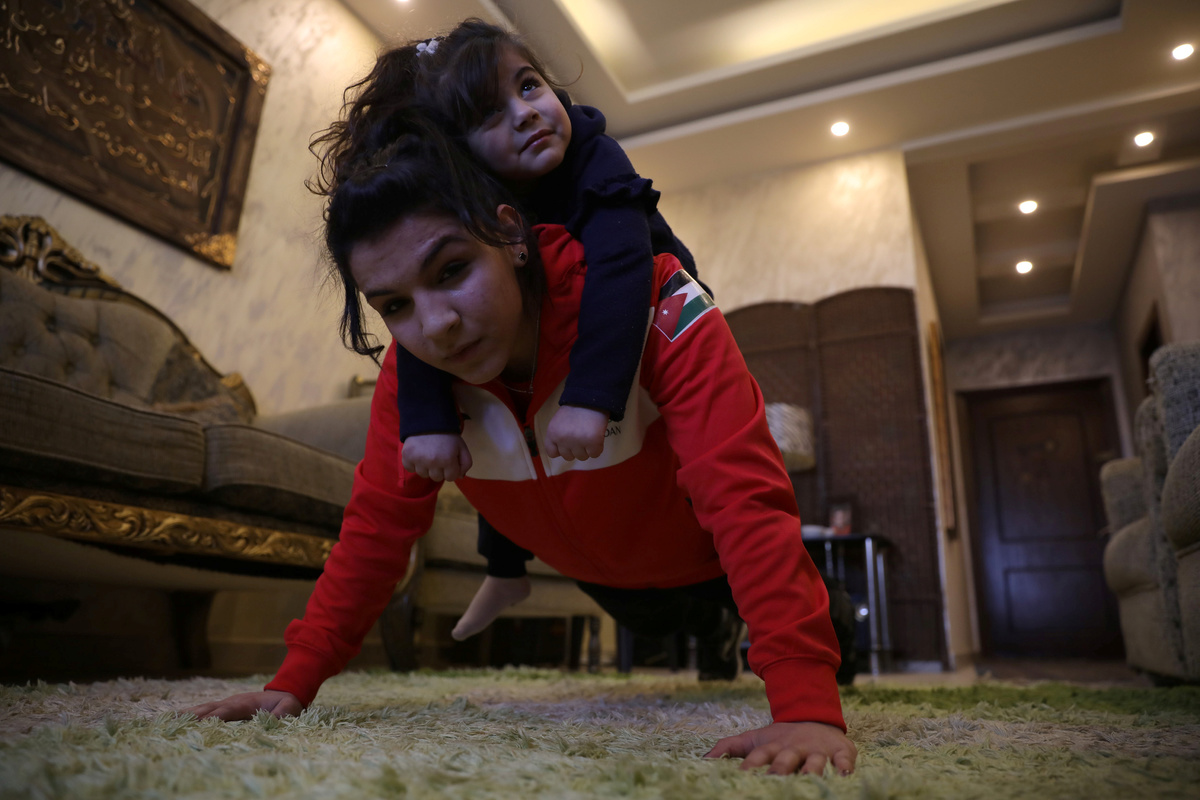 With no access to gym equipment during the lockdown in Jordan, Olympic hopeful judoka Hadeel Alami has hit upon an unorthodox way to stay in peak condition - using her little sister as a weight during her training routine.