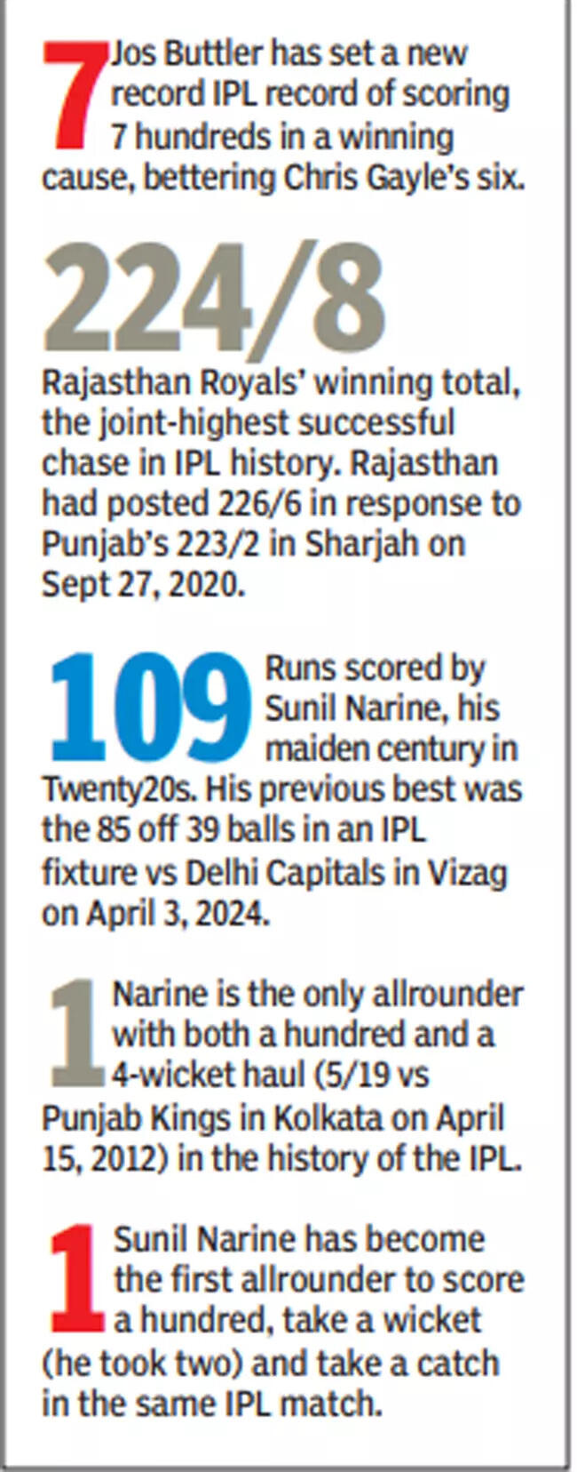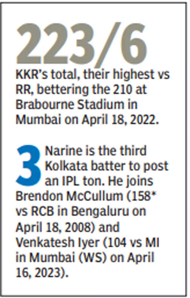 It was the opener’s belligerent 109 off 56 balls that helped the hosts post a strong 223 for six after RR captain Sanju Samson won the toss and decided to field first. However, Narine was not done yet as he returned to become the first player in an IPL match to score a hundred and then picked two wickets by trapping Dhruv Jurel and dangerman Rovman Powell in front and took a catch to dismiss Samson.