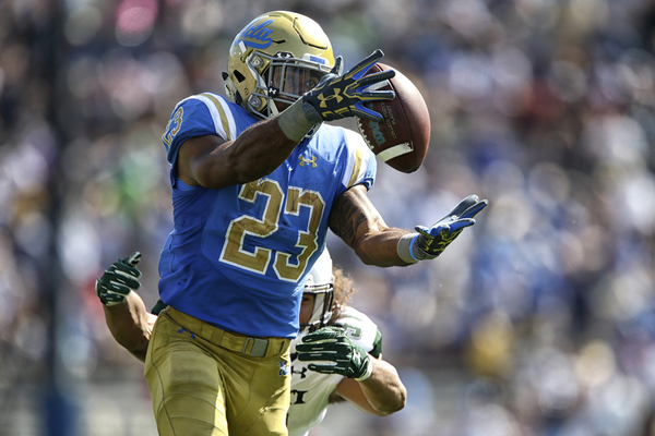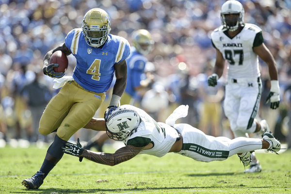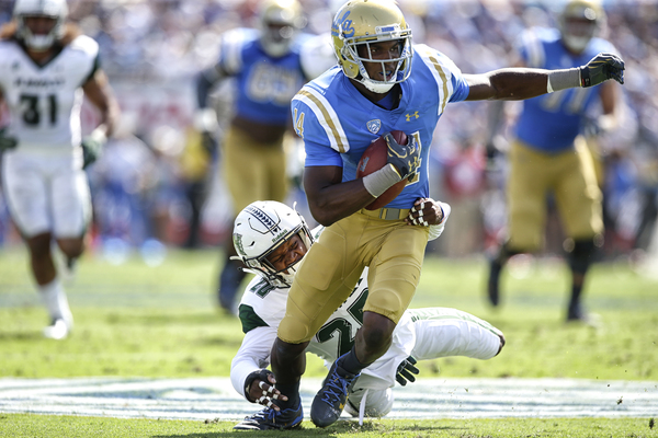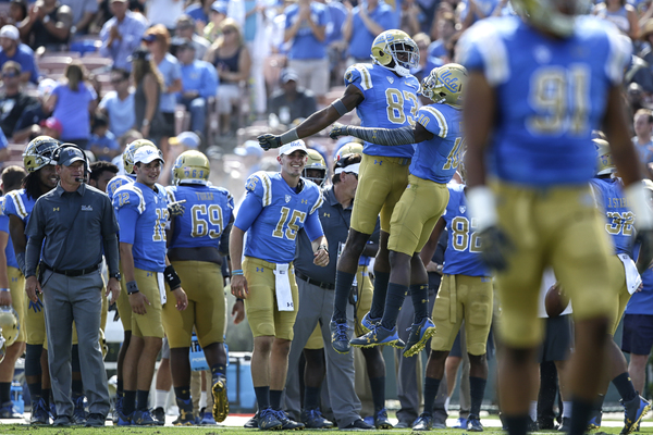 But UCLA's run defense was shredded for a second consecutive game and the Bruins (2-0) yielded 281 yards rushing. UCLA was also without five defensive starters after defensive tackle Boss Tagaloa watched the game in street clothes; linebacker Kenny Young and safeties Adarius Pickett and Jaleel Wadood were injured; and linebacker Josh Woods was ejected for targeting.