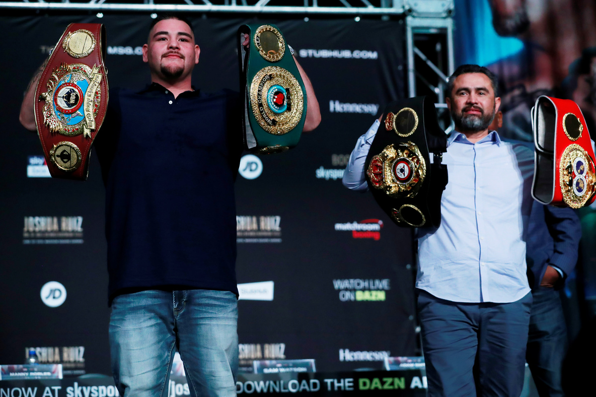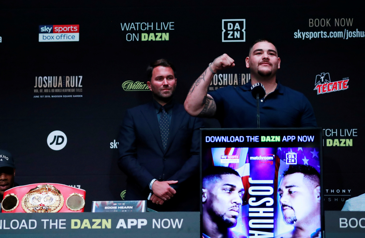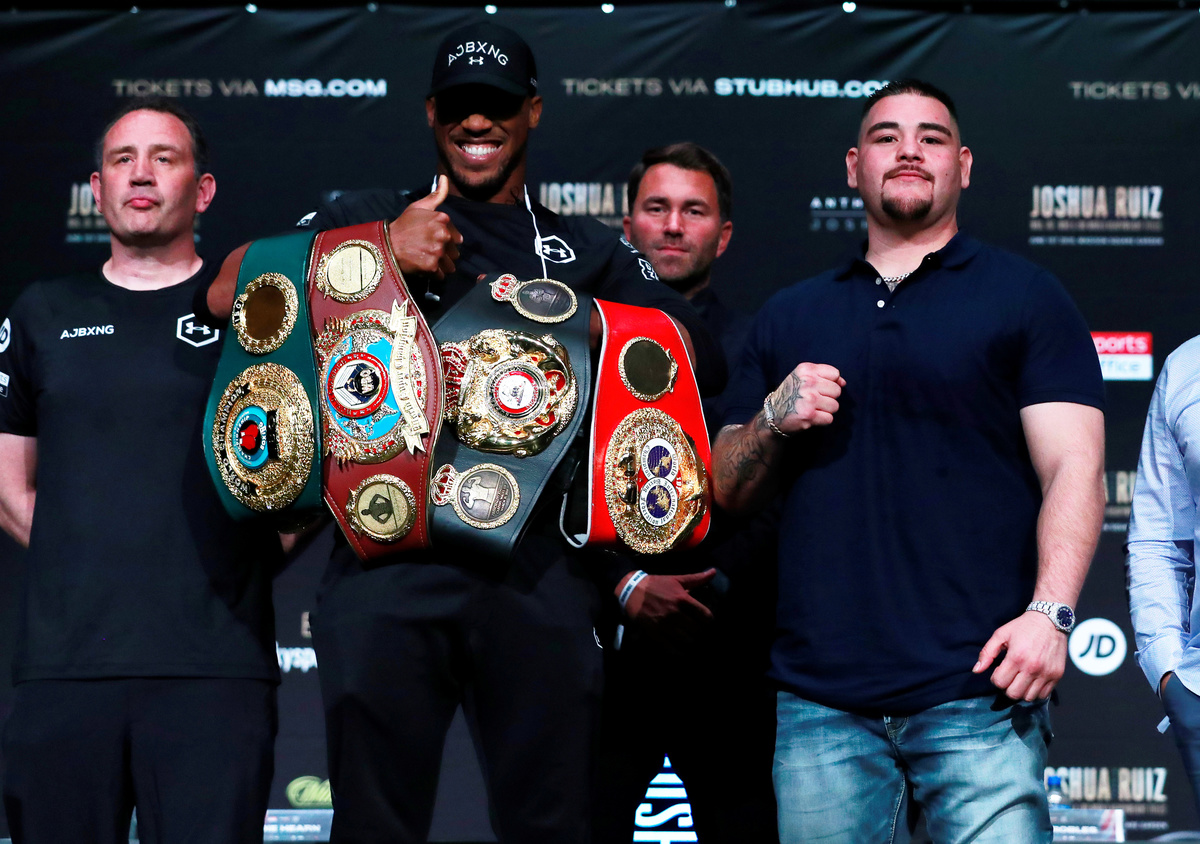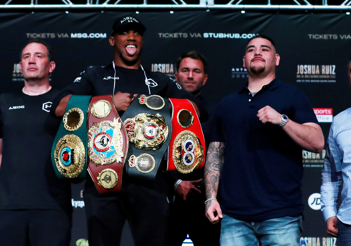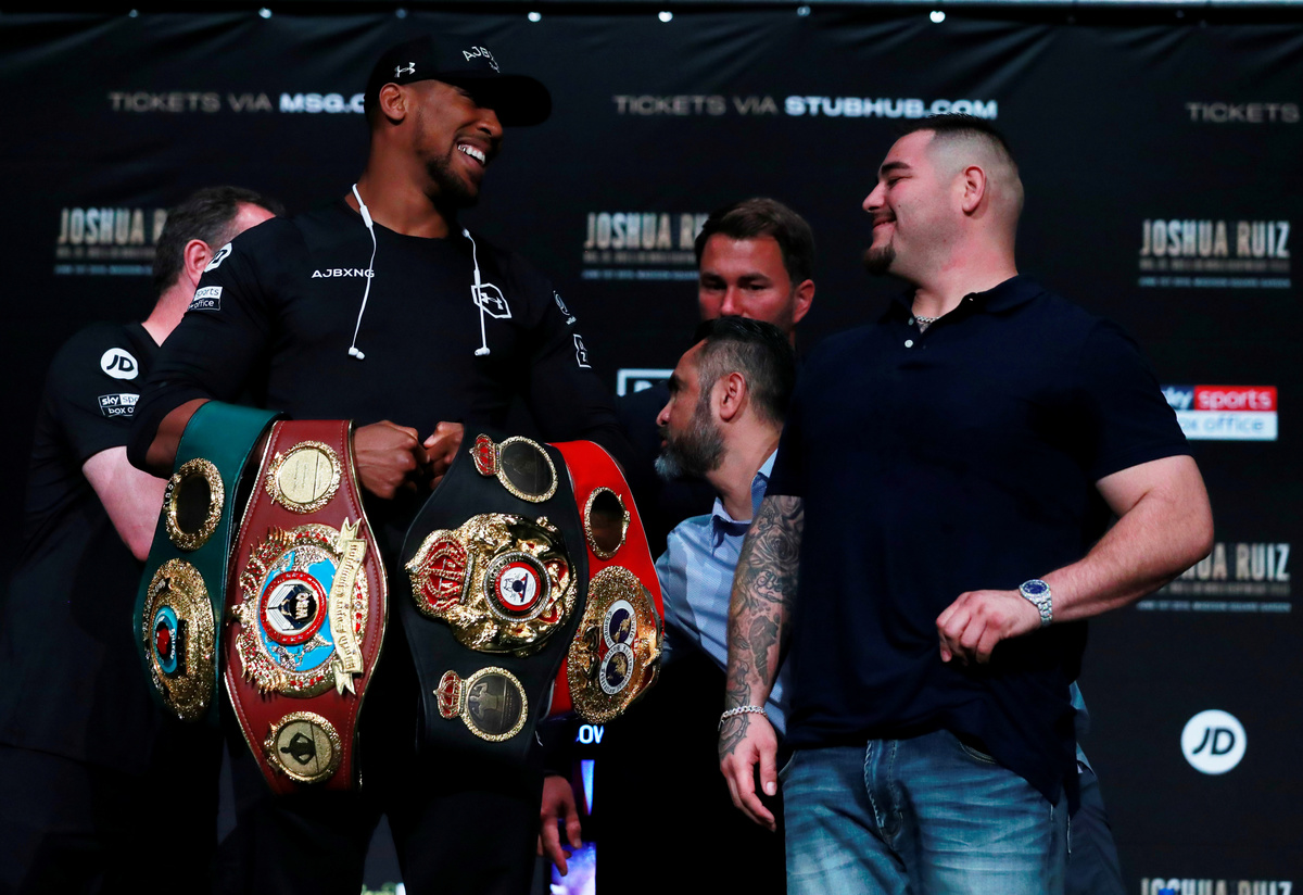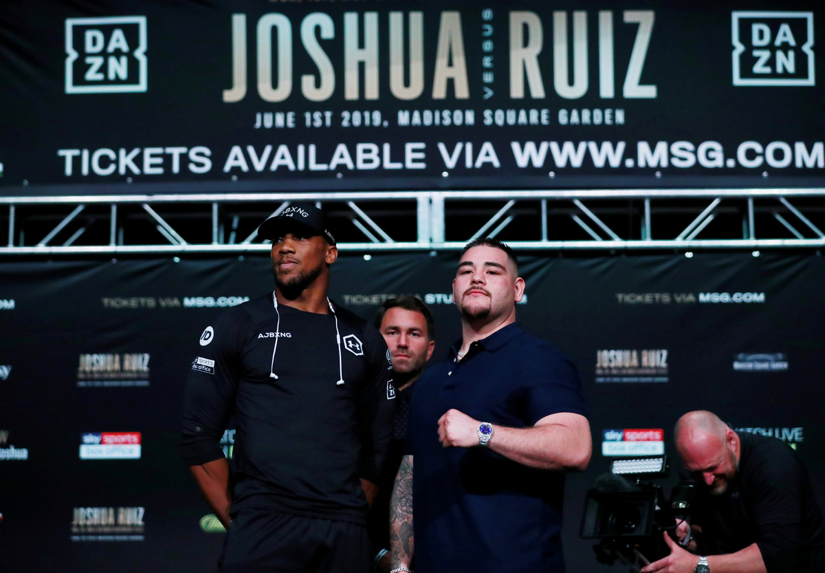 Boxing - Anthony Joshua & Andy Ruiz Jr Press Conference - Madison Square Garden, New York, United States - May 30, 2019 Anthony Joshua and Andy Ruiz Jr after the press conference Action Images via Reuters/Andrew CouldridgeBoxing - Anthony Joshua & Andy Ruiz Jr Press Conference - Madison Square Garden, New York, United States - May 30, 2019 Andy Ruiz Jr and promoter Eddie Hearn during the press conference Action Images via Reuters/Andrew CouldridgeBoxing - Anthony Joshua & Andy Ruiz Jr Press Conference - Madison Square Garden, New York, United States - May 30, 2019 Andy Ruiz Jr during the press conference Action Images via Reuters/Andrew CouldridgeBoxing - Anthony Joshua & Andy Ruiz Jr Press Conference - Madison Square Garden, New York, United States - May 30, 2019 Anthony Joshua and Andy Ruiz Jr pose after the press conference Action Images via Reuters/Andrew CouldridgeBoxing - Anthony Joshua & Andy Ruiz Jr Press Conference - Madison Square Garden, New York, United States - May 30, 2019 Anthony Joshua during the press conference Action Images via Reuters/Andrew Couldridge