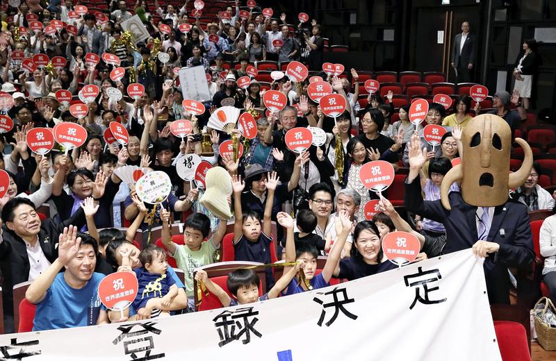 People react in joy at a public venue in Sakai, Osaka Prefecture, on Saturday, along with Haniwa Kacho -- a city mascot modeled after a brown clay burial figurine -- when hearing of the addition of the Mozu-Furuichi tumulus clusters to the World Cultural Heritage List. UNESCO's World Heritage Committee decided to include the group of ancient tombs in the prefecture in the list at its meeting in Baku on the day.