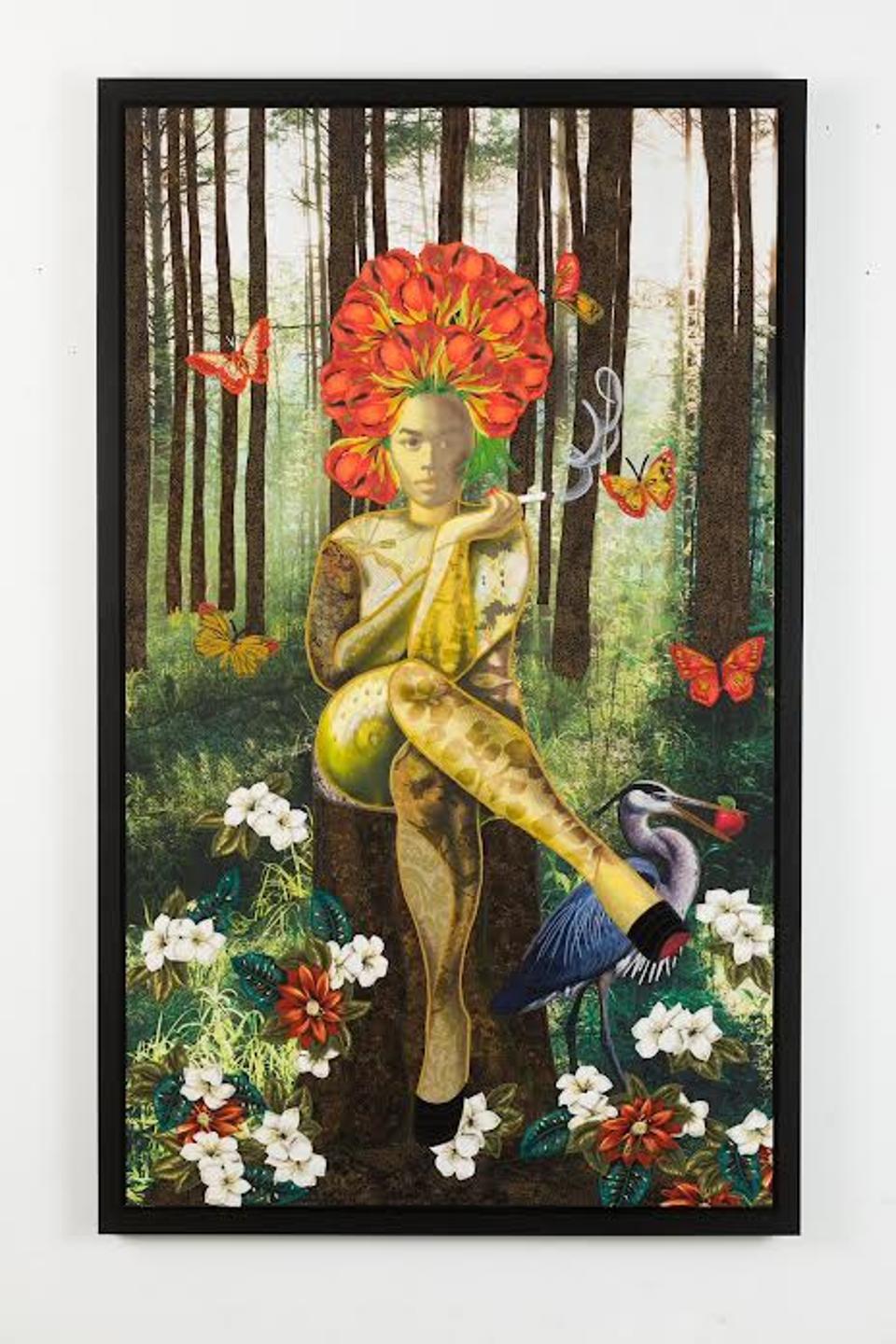 An elegant woman in high heels holds a lit cigarette and gazes at the viewer, her legs crossed as she sits on a tree stump that’s elevated to a throne by her regal presence. Flowers and butterflies abound along with a bird to complete this lush forest scene where nature once again flourishes amid womanly dominance and the embrace of decadence.