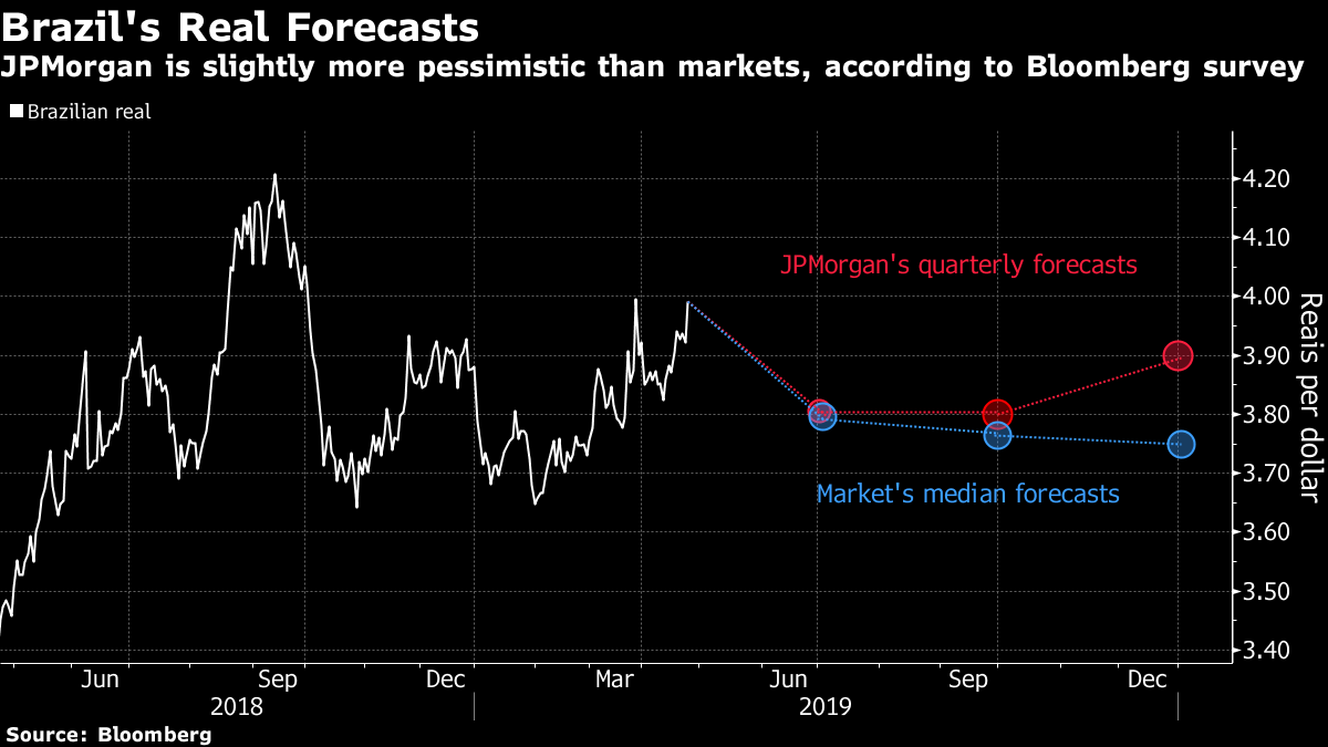 Cassiana Fernandez, JPMorgan Chase & Co.’s chief Brazil economist, sees the real at 3.90 per U.S. dollar by year’s end, more pessimistic than the 3.75 per dollar median forecast. That’s partially because she’s more downbeat than the market on growth, expecting the economy to expand just 1.5 percent this year, a far cry from her initial forecast of 2.3 percent.