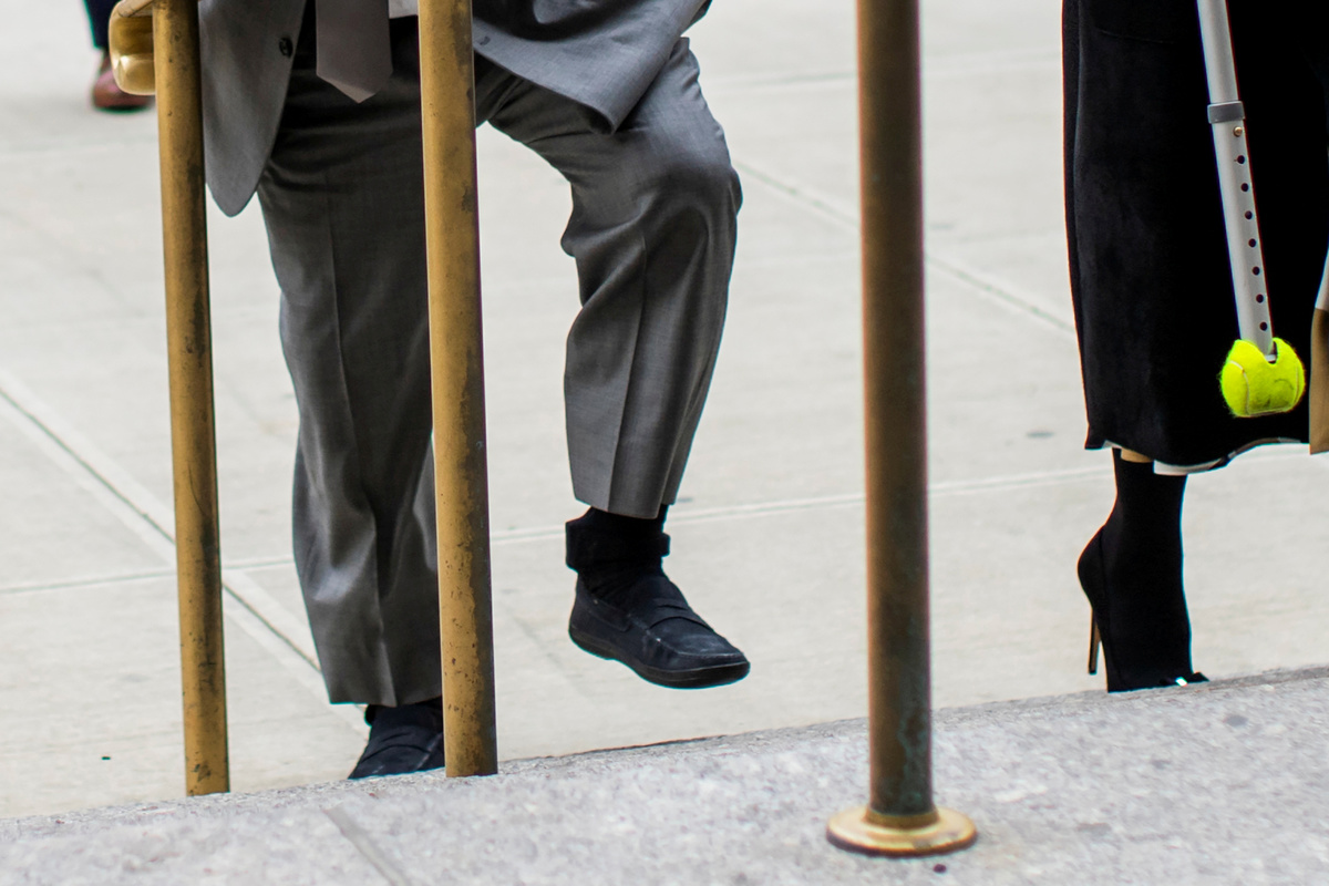 The once-powerful producer has been released on bail, but is required to wear an electronic-tracking device that was visible on his ankle when he arrived at court on Tuesday.