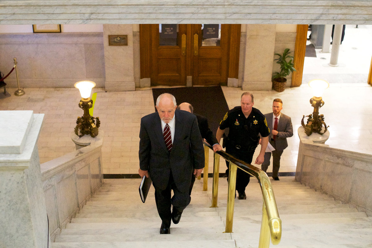 He was escorted out a back door of the courthouse with his hands and feet shackled and driven away in a black sport utility vehicle.