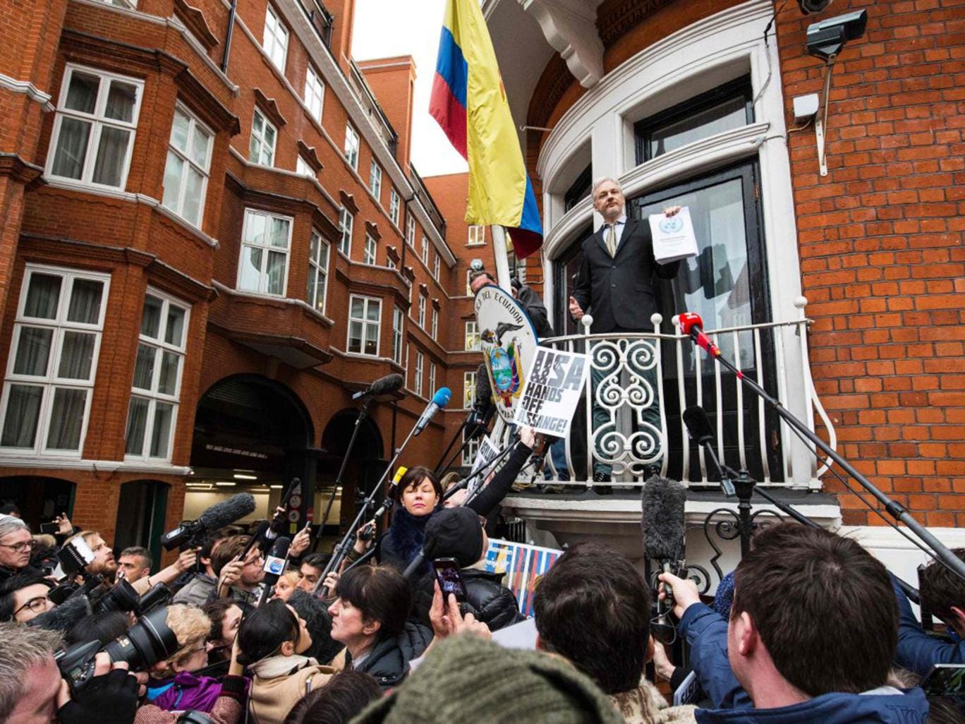 Instead, the 44-year-old Australian was faded into vision via a videolink. He told a packed press conference held precisely 2.2 miles from his cramped quarters that Britain now stood in defiance of international law after the UN Working Group on Arbitrary Detention (WGAD) accepted his claim that he is in effect being unlawfully imprisoned and declared he should be awarded compensation.