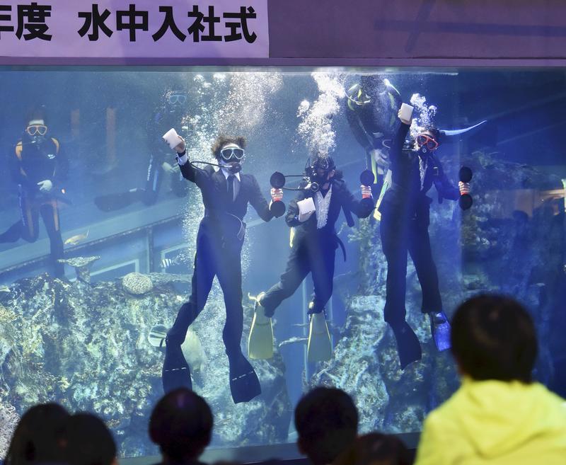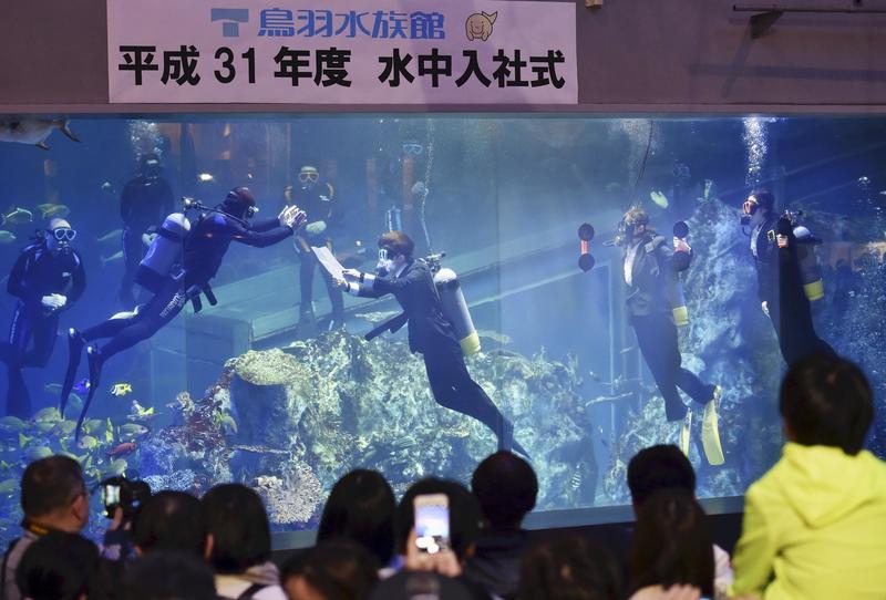 The annual "welcome ceremony in the water" was held at the Toba Aquarium in Toba, Mie Prefecture, with three new employees who are nationally certified divers receiving their official job appointments on behalf of themselves and two other new employees.