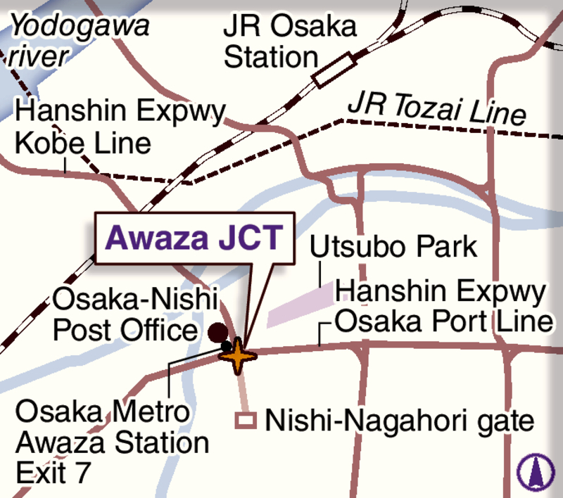 Awaza Junction connects the Osaka Port Line running east to west, the Kobe Line running north, and an interchange on the south side. About 130,000 vehicles pass through the junction each day. To merge with the Kobe Line and connect to an exit and entrance, the junction has a triple layer structure consisting of the Osaka Port Line and two roads over and under the line that run north-south. The road at the highest level of the junction is about 25 meters above the ground, and the lowest is about 10 meters up.