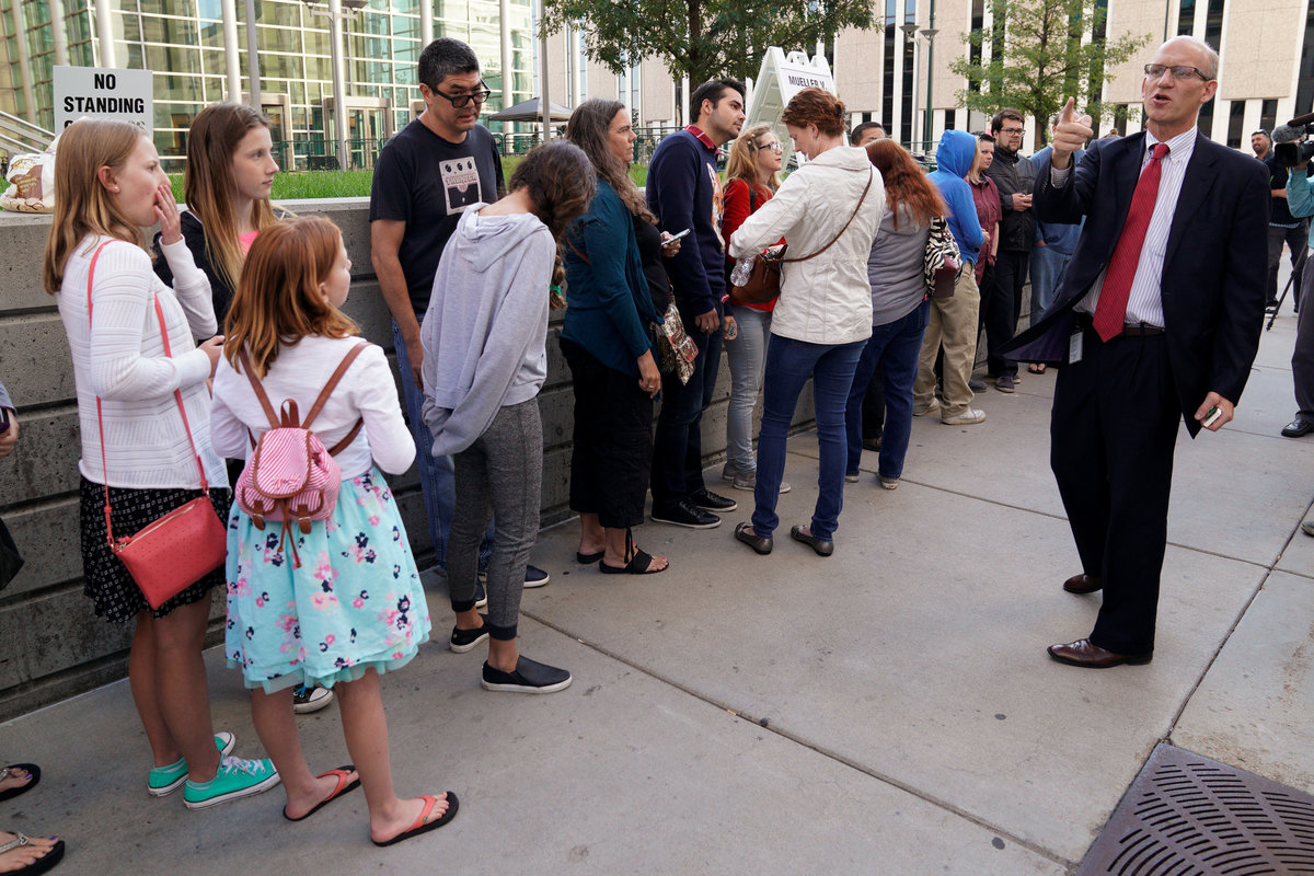 Jeff Colwell, Clerk of Court, gives instructions to Taylor Swift fans waiting to go into Denver Federal Court where the Taylor Swift groping trial goes on in Denver, U.S., August 14, 2017. REUTERS/Rick Wilking