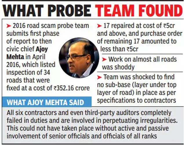 Following the scam, six contractors were blacklisted for seven years. It came to light in 2016, when then mayor Snehal Ambekar alleged malpractices in road repair work in a confidential letter to then municipal commissioner Ajoy Mehta. While a probe was conducted by deputy municipal commissioner Vasant Prabhu and S O Kori, chief engineer (bridges), it was led by then additional municipal commissioner Sanjay Deshmukh.
