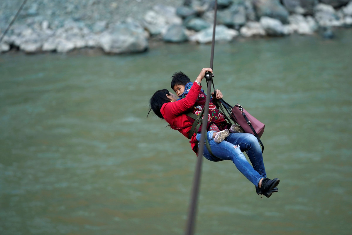 NUJIANG, China (Reuters) - Cha Huilan, a mother of two living in a Chinese mountain village cut off by a raging river, dangles from a harness hooked to a zipline every time she crosses its violent rapids and jagged rocks on frequent trips to buy medicine for her mother.