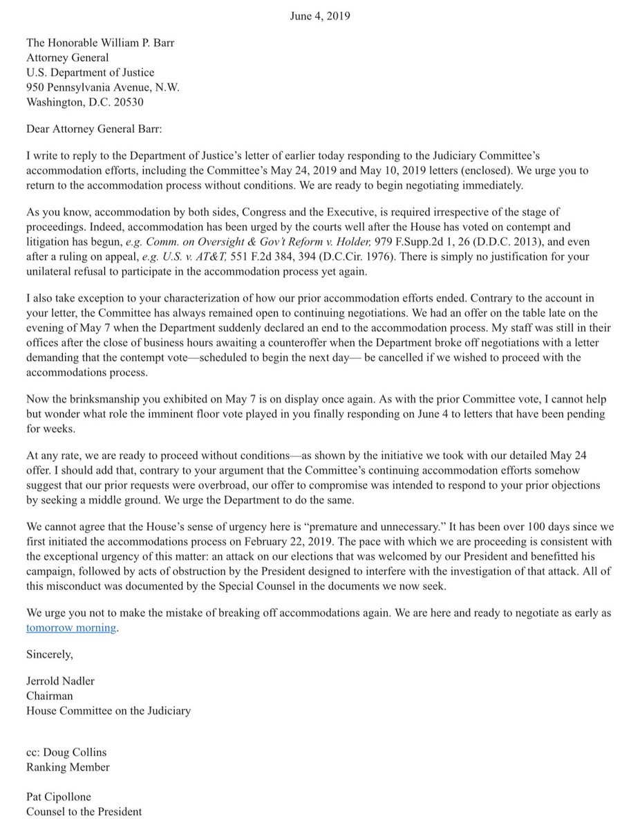 Catch up quick: The DOJ claims Nadler sent a letter on May 24 recognizing that the committee's subpoena was "unworkably broad" and offering for the first time "to narrow the subpoena's scope to cover a much more limited set of documents." In light of this offer, DOJ asserted that it would "hardly make sense" to hold Barr in contempt for not complying with the original subpoena and asked the House Judiciary Committee to withdraw its previous contempt citation so that the two sides could negotiate an accommodation.