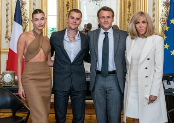 On Monday - France’s annual Fête de la Musique, or Music Day - the 27-year-old Canadian singer took to Instagram to share a snap of himself alongside his wife Hailey, French President Emmanuel Macron and his wife Brigitte.