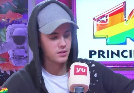 Bieber was a guest on Spanish radio station 40 Principales to promote his new album, Purpose. A video of the nine minute interview was posted by Vodaphone Yu on Wednesday and watched over 245,000 times before being taken down on Thursday.
